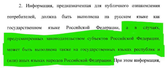 2) Информация, предназначенная для публичного ознакомления потребителей, должна быть выполнена на русском языке как государственном языке Российской Федерации, a в случаях, предусмотренных законодательством субъектов Российской Федерации, может быть выполнена также на государственных языках республик и (или) иных языках народов Российской Федерации. При этом информация, предназначенная для публичного ознакомления потребителей и выполненная на государственных языках республик и (или) иных языках народов Российской Федерации, должна быть идентичной по содержанию информации, предназначенной для публичного ознакомления потребителей и выполненной на русском языке как государственном языке Российской Федерации, а также равнозначной по размещению И техническому оформлению в соответствии с частью 2 статьи 3 Федерального закона от 1 июня 2005 года № 53-ФЗ «О государственном языке Российской Федерации».