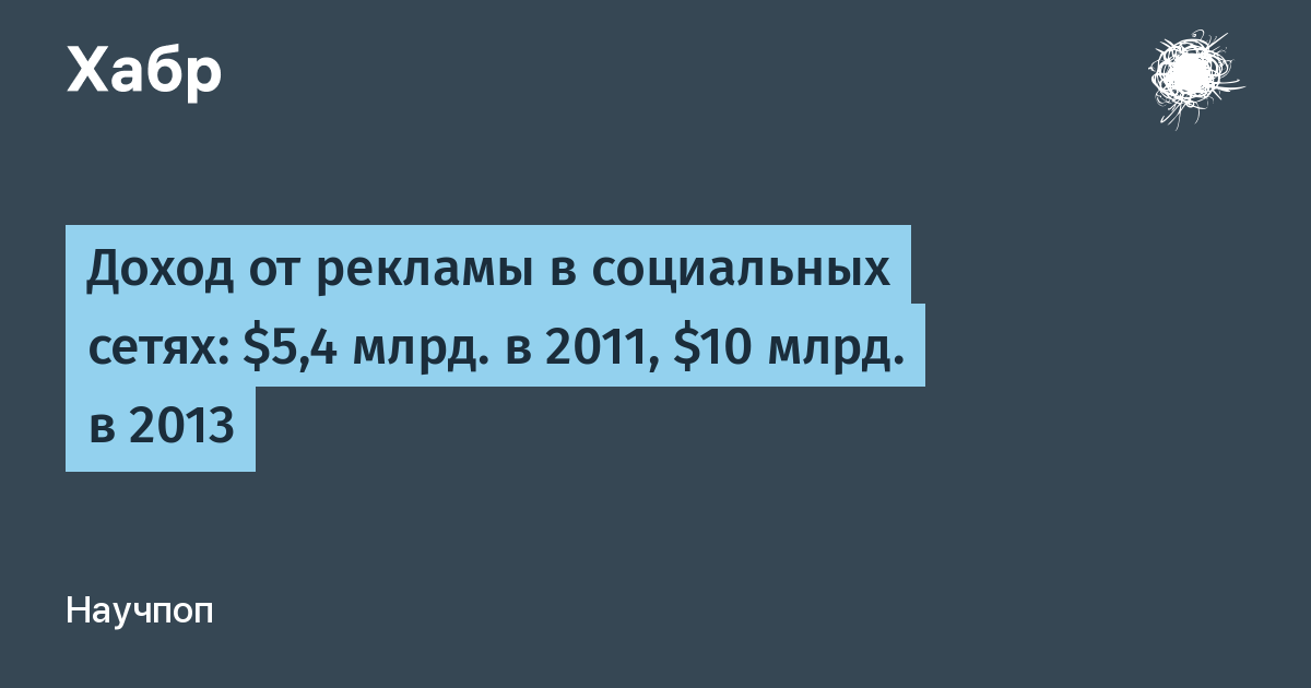 По оценкам аналитиков eMarketer, мировая прибыль от рекламы в социальных сетях достигнет 5,54 млрд долларов в 2011 г. – и возрастет вдвое к 2013 г. Подсчет составлен компанией eMarketer на основе целого ряда популярных социальных сетей, включая Facebook, Twitter и LinkedIn.