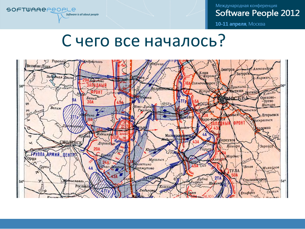 В данной статье я расскажу о новом способе визуализации хода IT-проектов, который мы стали применять у себя в компании недавно наравне с другими подходами, и несмотря на небольшой практический опыт мы уже получаем профиты от использования данного метода. На самом деле это даже не совсем статья, а конспект доклада на конференции Software People 2012. Обращаю ваше внимание, что речь не идет о новой методике ведения проекта! Речь идёт о новом типе диаграмм, которые мы называем «проектные карты», и внешне эти диаграммы очень похожи на военные карты, описывающие боевые действия.
