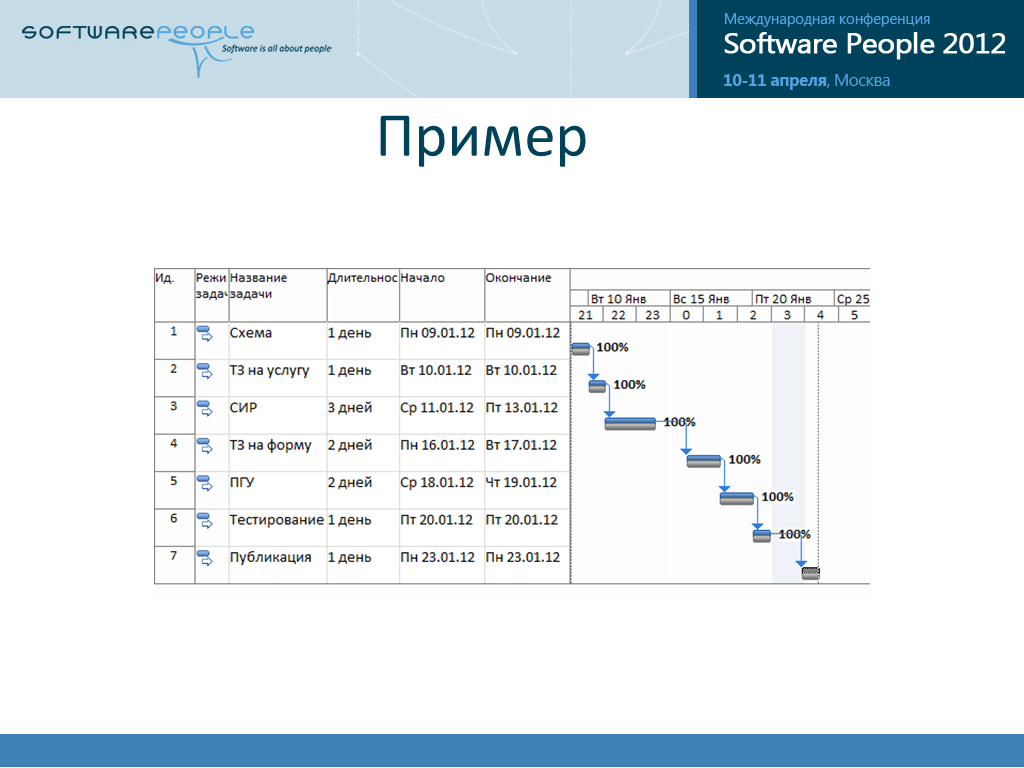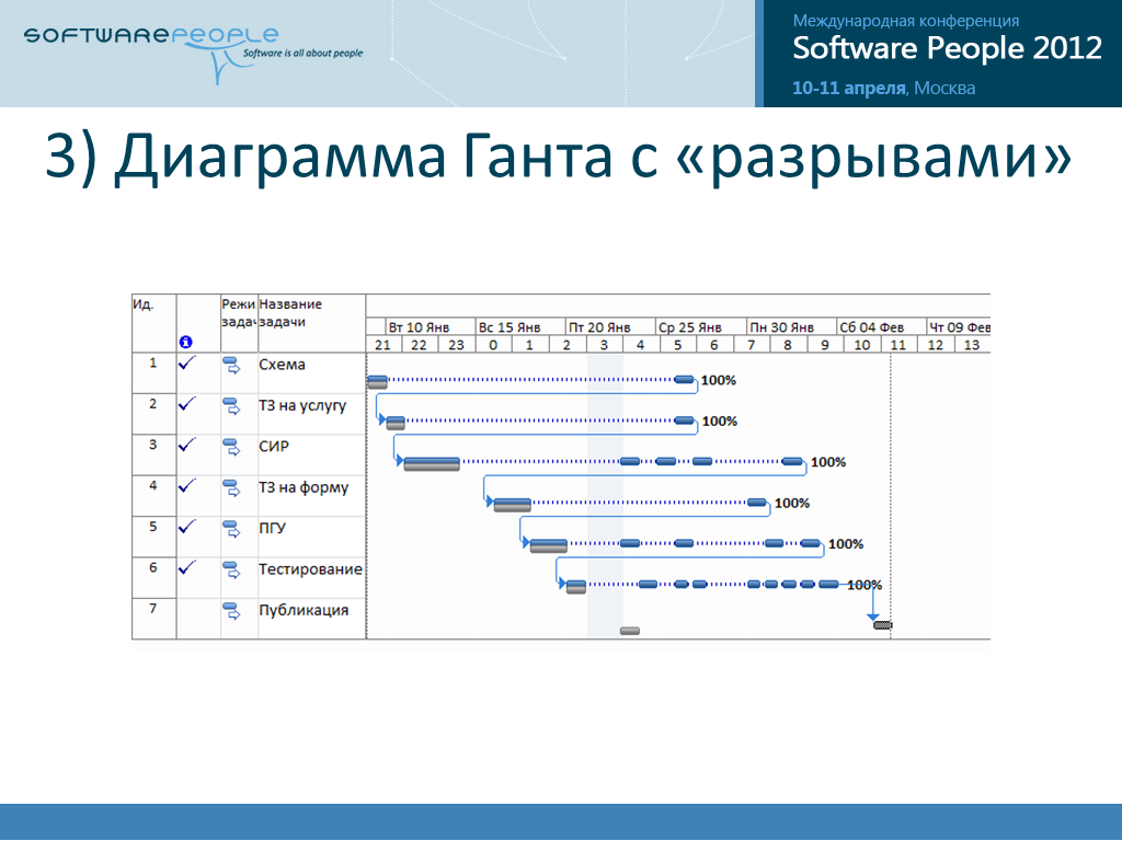 Проблема в том, что мы имеем дело с проектами по разработке программного обеспечения. И значит необходимо помнить еще про 2 особенности, которые присущи всем таким проектам: во-первых, часто исполнители самостоятельно меняют порядок выполнения задач, и во-вторых, они часто переключаются между задачами. И это нормально. Но на диаграмме Ганта все эти случаи будут отображаться одинаково.