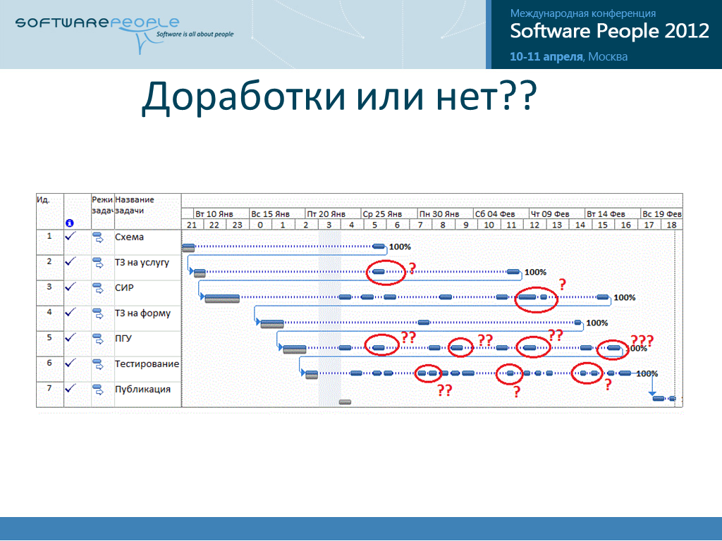 И, казалось бы, эта диаграмма будет и дальше прекрасно справляться с визуализацией хода проекта. Но это не совсем так. Многие из читающих эту статью имеют дело именно с проектами по разработке программного обеспечения. И есть там один этап, который всегда превращает понятные изначально планы на диаграммах Ганта в нечто монстроподобное и плохопонимаемое. Я говорю об этапе тестирования. На котором в 90% случаев тестировщиками обнаруживаются ошибки, допущенные исполнителями на предыдущих этапах, и возникает потребность в дополнительных работах, которые мы называем просто «доработки». И давайте посмотрим, как диаграмма Ганта отобразит нам эти доработки, а потом сравним с тем, что может предложить нам проектная карта. После чего, я думаю, вы сами убедитесь, что проектная карта в этом случае предпочтительнее.