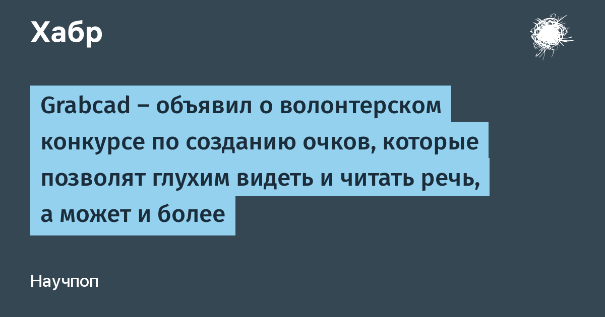 По моему мнению компания Грэбкад (grabcad) задумала очень смелый и интересный конкурс по созданию чего-то на подобии бюджетных умных очков дополненной реальности для глухих. Идея родилась у плохослышащей девочки подростка и поддержана участниками проекта Грэбкад.