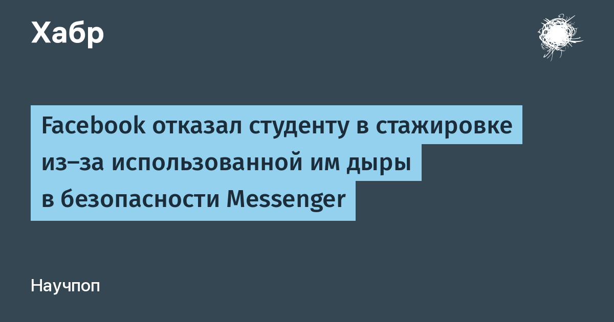 Три месяца назад студент Гарварда Аран Кханна (Aran Khanna) готовился начать стажировку в Facebook, но за пару часов до поездки получил звонок с отказом. Причиной стало «неэтичное» поведение студента: Кханна опубликовал расширение для Chrome, которое показывает место отправления сообщений в Facebook Messenger. Эти данные мессенджер отправляет по умолчанию с каждым сообщением из мобильного приложения.