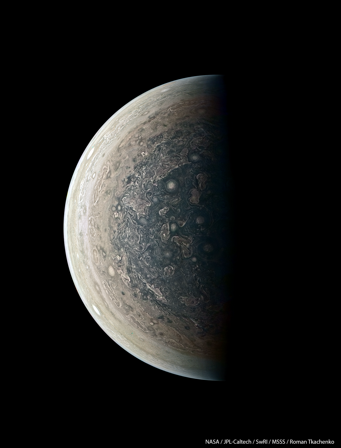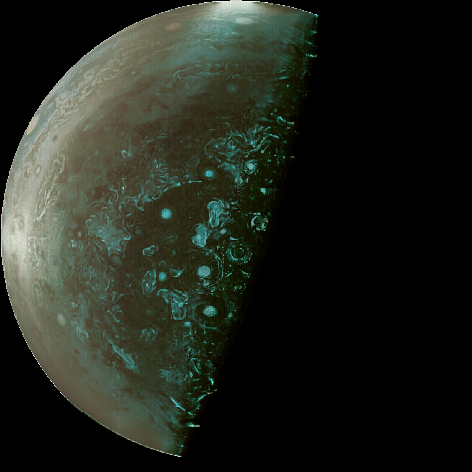 Свежее фото южного полюса, снятое на четвертом сближении с Юпитером 2 февраля. Обработка Романа Ткаченко.