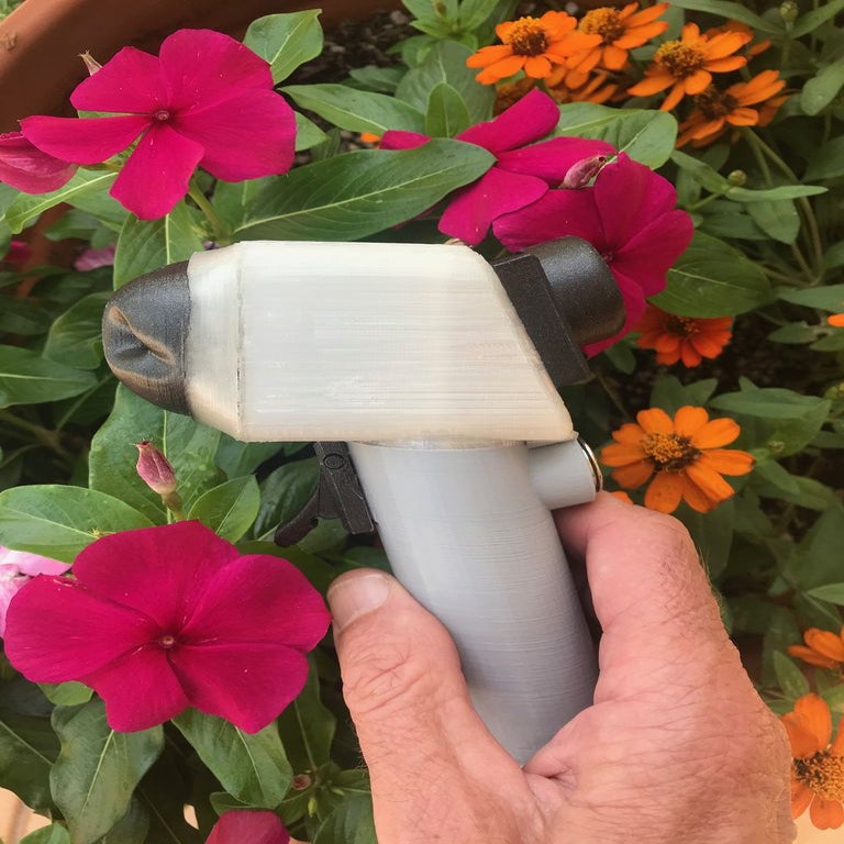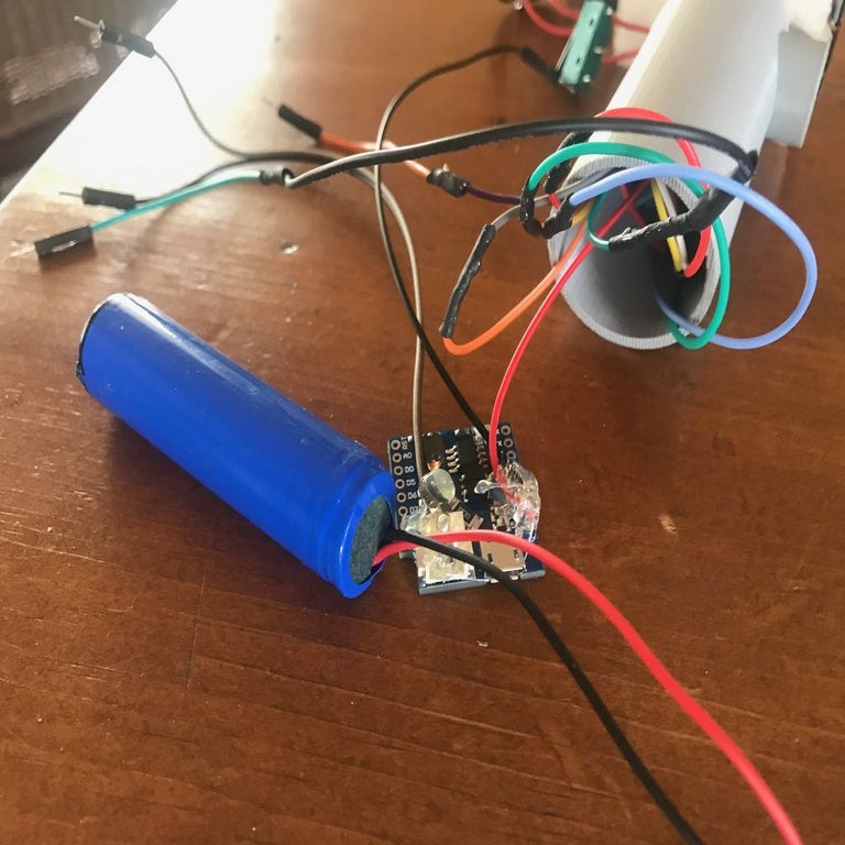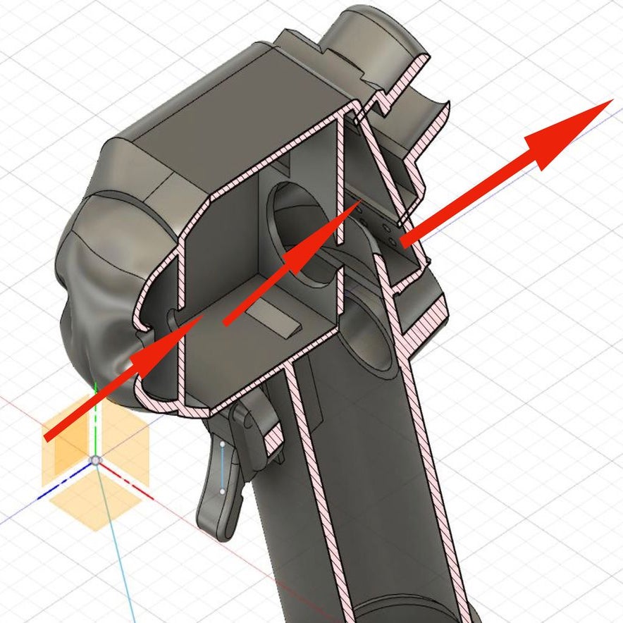 Сначала кольцо Neopixel приклеивается к корпусу носа так, чтобы оно не перекосилось и не нарушилось его прочное соединение с основным корпусом. Пропустите три провода через боковое отверстие главного корпуса и далее в рукоятку. Кольцо Neopixel должно смотреть в полупрозрачную часть корпуса. Затем датчик воздуха располагается в корпусе так, чтобы его входные отверстия смотрели по направлению к ноздрям, а вентилятор дул назад. Протяните провода с задней части вниз, в середину рукоятки – там их нужно будет припаять �� ESP32. Экран I2C соединяется с передней частью, а его выходные провода проходят через щель в рукоятку и подходят к основной плате. Круглый козырёк после этого приклеивается над экраном. Я использую клей E6000, однако подойдёт и суперклей. Нос с ноздрями приклеивается к передней части. Ограничивающий переключатель подключается к проводам и приклеивается на своё место, как и основная кнопка включения. Плата ESP вставляется внутрь, после чего устанавливается аккумулятор 18650. Шилд питания приклеивается к нижней части устройства так, чтобы порт зарядки находился точно напротив отверстия. После проверки работоспособности приклейте нижнюю часть корпуса к корпусу. Спусковой крючок приклеивается над металлической полоской ограничительного переключателя так, чтобы он легко нажимался до нижнего положения. Осторожно — не залейте клеем механизм переключателя.