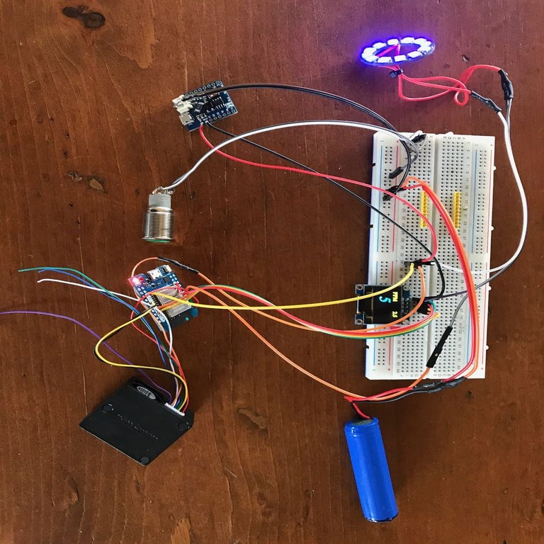 Диаграмма подключения практически такая же, как в моём проекте аналогового измерителя загрязнений для велосипеда [основанном, в свою очередь, на проекте любительского датчика загрязнения воздуха], за исключением того, что здесь нет сервомотора, а выход используется для линии данных кольца Neopixel. В данном случае кнопка включения подаёт питание от батареи только на шилд питания для беспроводного модуля. 5 В на шилде питания управляется ограничивающим переключателем в рукоятке, работающем, как спусковой крючок. Он даёт питание с шилда и на датчик, и на ESP32, и на кольцо Neopixel одновременно. Дисплей I2C получает 3В с ESP32. Большую часть подключения нужно сделать до сборки рукоятки, пропустив провода через различные отверстия. Обязательно предварительно проверьте схему на доске для прототипирования!