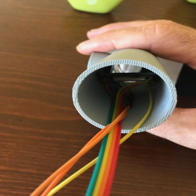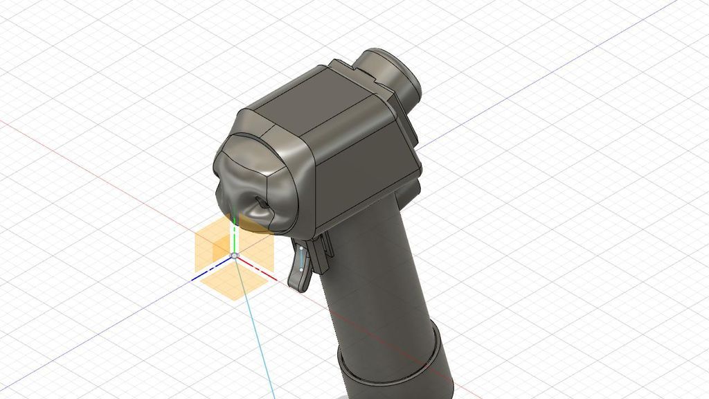 Я специально спроектировал корпус так, чтобы отверстия совпадали с встроенными в датчик от HoneyWell вентиляторами, отверстия ноздрей напрямую шли на вход датчику, а выдуваемый воздух выходил через несколько отверстий в обтекателе корпуса (извините за то, что это звучит, как заявка на патент). Большая рукоятка позволяет разместить достаточно объёмный аккумулятор и остальную электронику. Зарядный порт расположен вровень с нижней частью рукоятки. Кольцо Neopixel должно подсвечивать верхнюю часть корпуса. Проект сделан так, чтобы верхнюю часть корпуса можно было напечатать прозрачным PLA, потом переключиться на серый PLA для ручки, и снова перейти на прозрачный пластик в нижней части рукоятки, чтобы было видно индикаторные светодиоды во время зарядки. Механизм включения снабжён шарниром и печатается совместно с корпусом, но должен двигаться свободно.