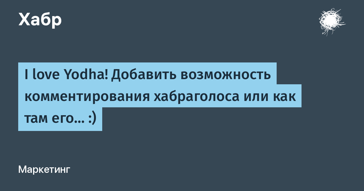 roman_gorshkov Nov 1 2006 at 21:10I love Yodha! Добавить возможность комментирования хабраголоса или как там его… :)Reading time1 minViews790HabrsubjTags:хабраголосили как там егохабрахабрstar warsзвездные войнHubs:Habr