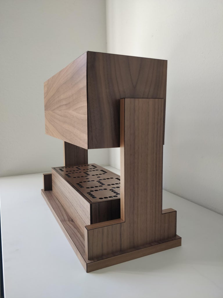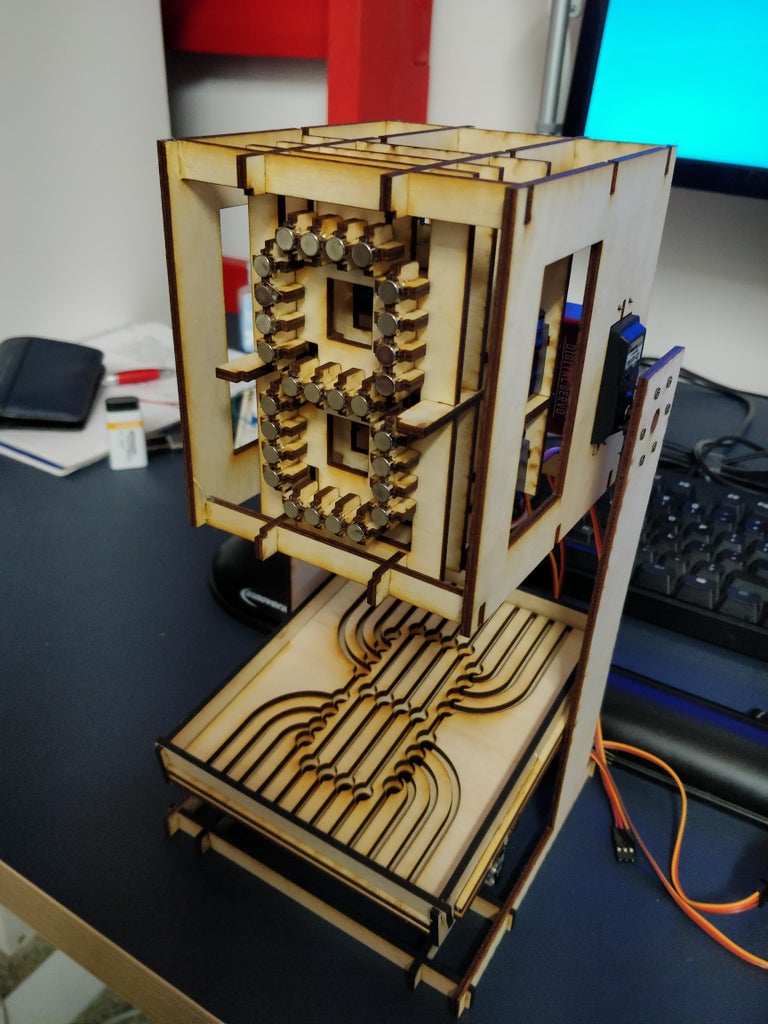 На боковых стенках закреплены два мотора 20Kg, вращающие весь корпус для загрузки и разгрузки шаров. Кстати, в дальнейшем я не буду использовать разные материалы для одного проекта. Я хотел, чтобы часы по большей части были прозрачными, с небольшой деревянной отделкой. Работать с материалами разной толщины, у которых к тому же получается разная толщина разреза в лазерном резаке, было очень сложно.