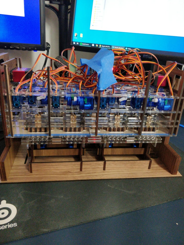 Сервомоторы подключены к соединительным проводам. По одному проводу идёт к каждому из сегментов чисел, и на каждый сегмент есть по четыре магнита. Нужно просто повторить всё это 28 раз.