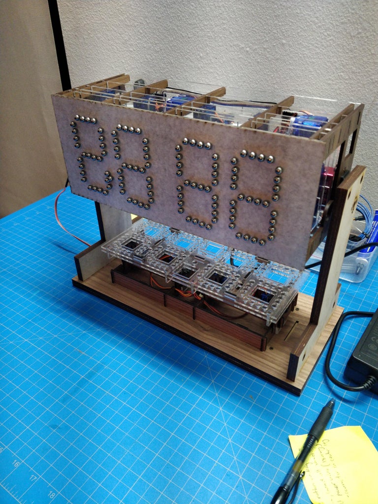 У подъёмного механизма есть 4 мотора, помогающие поднимать и опускать платформу, где стальные шарики выстраиваются под сегменты цифр. Подъём осуществляется посредством простой реечной передачи.
