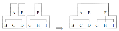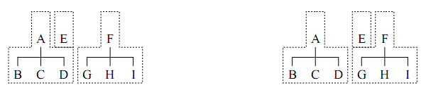 Критической операцией является подгонка поддеревьев. У каждого поддерева есть пространство — пустая зона вокруг дерева. Так как форма поддеревьев не должна меняться, их пространства подгоняются так плотно, насколько это возможно. К сожалению, конечная позиция поддеревьев в этом случае будет зависеть от порядка, в котором мы производим подгонку. Пример двух различных подгонок одинаковых пространств: