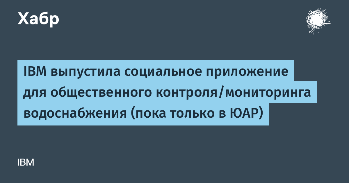 В моем регионе, как и во многих других, часто случаются порывы труб, по которым течет холодная/горячая вода. Такие порывы, если они невелики, соответствующие службы не спешат ликвидировать. Собственно говоря, в России/Украине/Беларуси никто особо не переживает из-за потерь воды. Вероятно, потому, что воды много (пока), и потому, что ответственных сложно найти. Лично я частенько задумываюсь о том, сколько же хорошей, чистой воды утекает в никуда в результате такой халатности. В странах, где воды не очень много, над этой проблемой задумывается не один и не два человека, подобные вопросы стараются решать, и решать быстро. Для того, чтобы улучшить контроль/мониторинг водоснабжения в такой стране, как ЮАР, корпорация IBM разработала специальное приложение для Android. С помощью этого приложения, получившего название WaterWatchers, любой владелец android-смартфона сможет отметить на карте проблемный участок (нечто вроде «РосЯмы», только направленность иная).