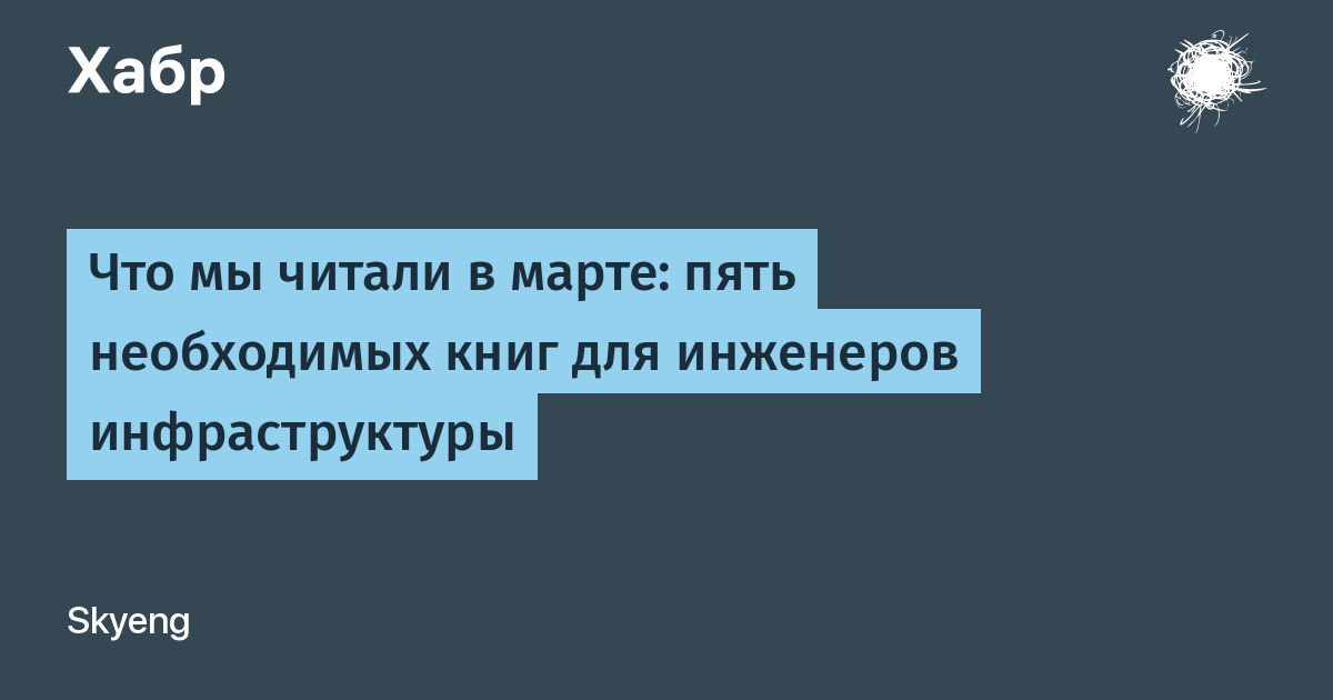 Мы в Skyeng понемногу строим свою библиотеку важных и полезных книг. Началось все с того, что своими списками в Фейсбуке поделились основатели компании (ссылки ниже), а теперь к ним присоединились и руководители направлений. В марте свой топ профессиональной литературы представила Надежда Рябцова, отвечающая за нашу IT инфраструктуру. Я попросил ее рассказать о каждой книге чуть подробнее – надеюсь, читателям Хабры этот список, дополненный четырьмя еженедельными рассылками, будет полезен.