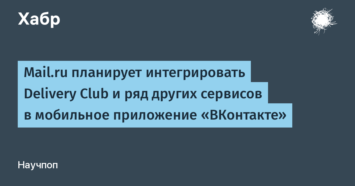 Компания Mail.ru Group планирует интегрировать ряд сервисов, в том числе и сервис заказа и доставки еды Delivery Club, в мобильное приложение социальной сети «ВКонтакте», сообщают «Известия».