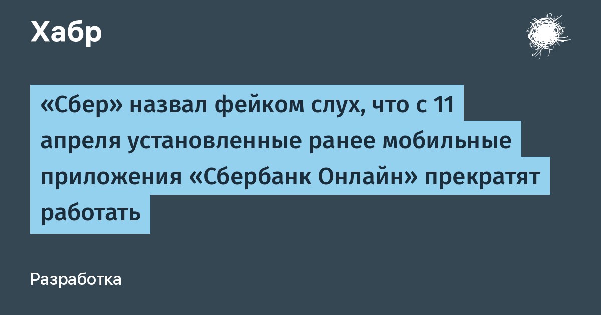 9 апреля «Сбер» назвал фейком распространяемые сейчас в сети слухи о том, что с 11 апреля установленные ранее мобильные приложения «Сбербанк Онлайн» прекратят работать на iOS и Android.