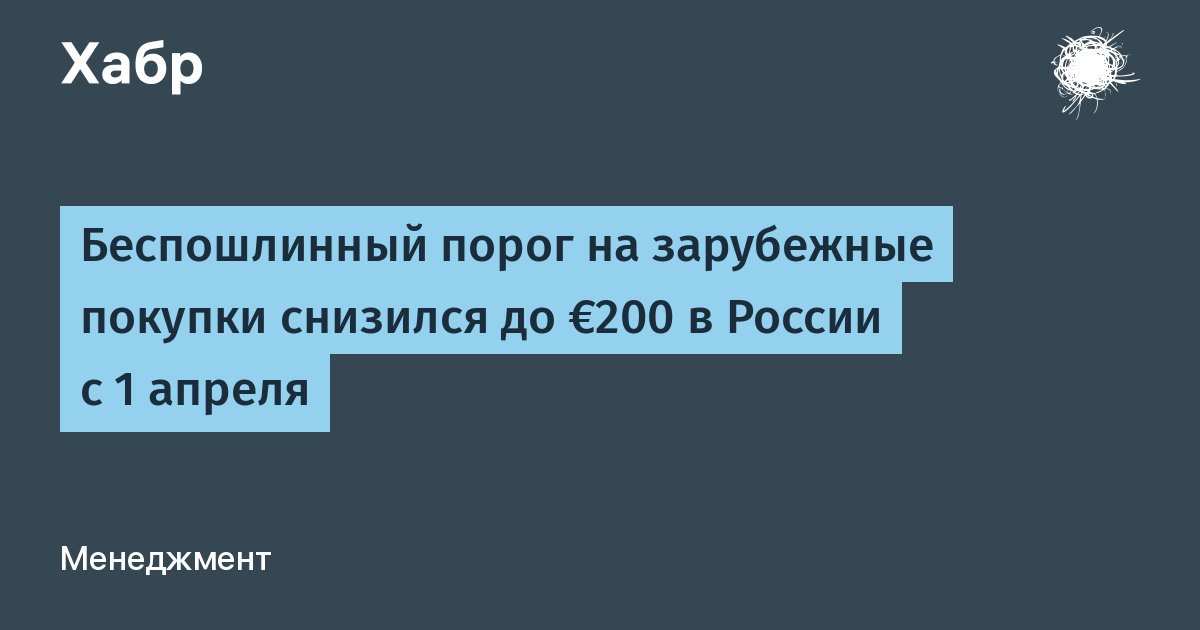 С 1 апреля в России действует новый порог для беспошлинного ввоза посылок из-за границы: €200 вместо €1 тыс. Новый лимит будет распространяться и на покупки, сделанные до снижения порога, если они ещё не прошли таможенный контроль, сообщает РБК.