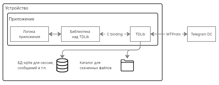 Telegram предоставляет библиотеку TDLib (Telegram Database library), которая закрывает вопросы сетевого взаимодействия между клиентом и сервером (дата-центрами Telegram), а также реализует поддержку сессий, кэширование сообщений и сохранение файлов. Библиотека предоставляет все сообщения протокола и методы их отправки и получения. TDLib написан на C++.