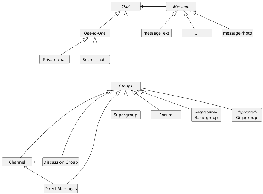 В Telegram: чат (chat) и сообщения (message) это основные понятия. Каждое сообщение принадлежит одному чату, а в чате может быть много сообщений (или не быть ни одного). Каналы, группы — сс точки зрения API Telegram это разные типы чатов.