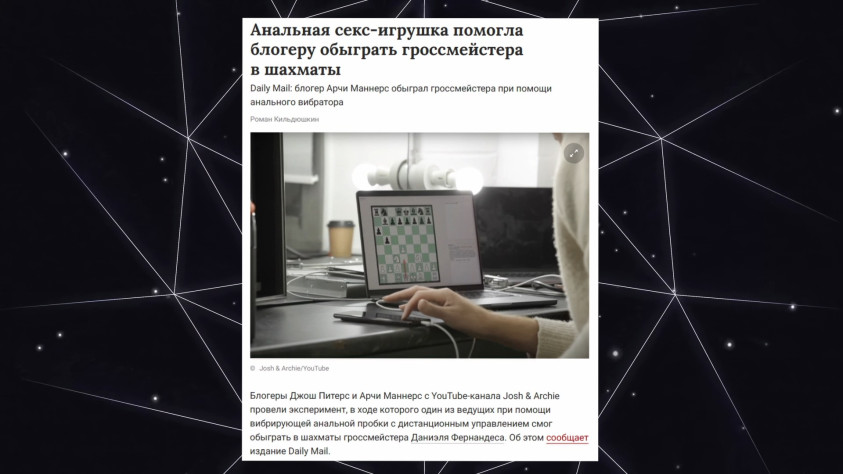 Блогеры сумели обыграть гроссмейстера, используя весьма нестандартный способ передачи подсказок: секс игрушку в анусе, которой удалённо управляли и с помощью вибраций передавали подсказки по ходам.