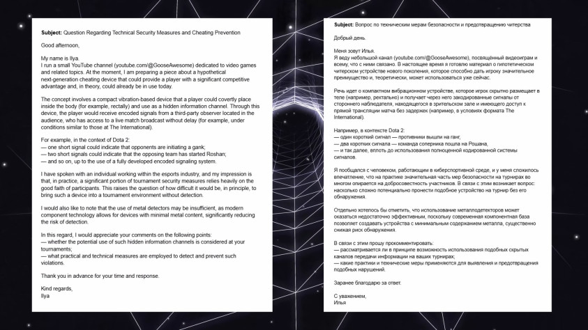 По этой причине я направил официальное обращение в международные киберспортивные организации ESL, BLAST.TV и PGL, чтобы выяснить, какие меры они применяют для исключения возможности подобного жульничества.