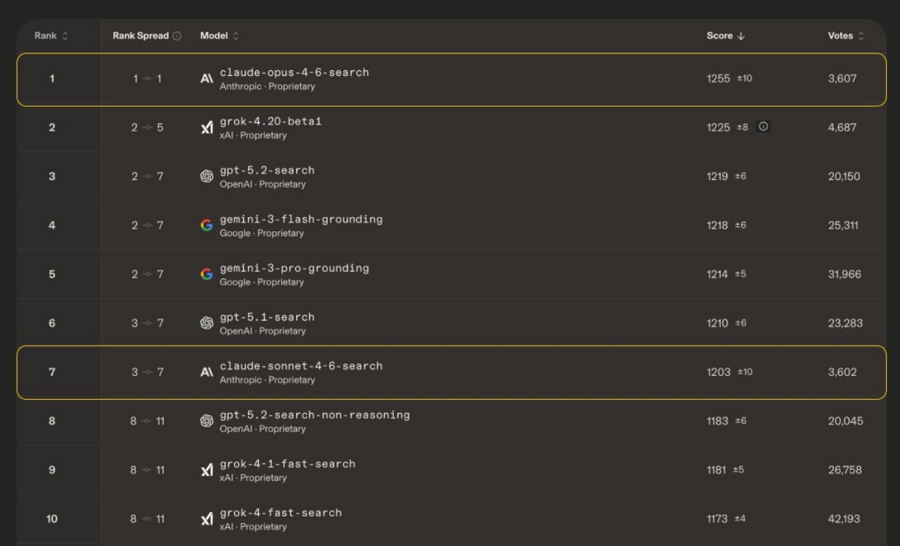Младшая модель Anthropic — Claude Sonnet 4.6 — заняла седьмую строчку (1203 балла), расположившись на уровне GPT-5.1-search от OpenAI.