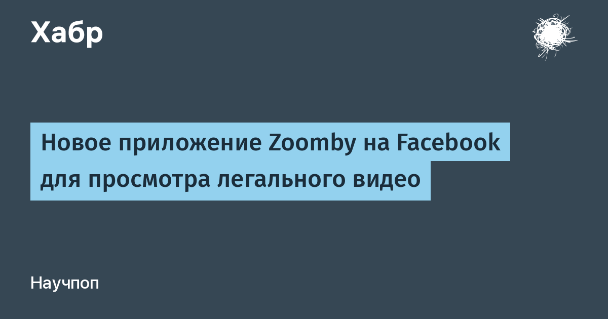 В Facebook запущено приложение для просмотра легального видео Zoomby. Приложение дает доступ к контенту 13 телеканалов (в том числе СТС, MTV и других) и 7 киностудий.
