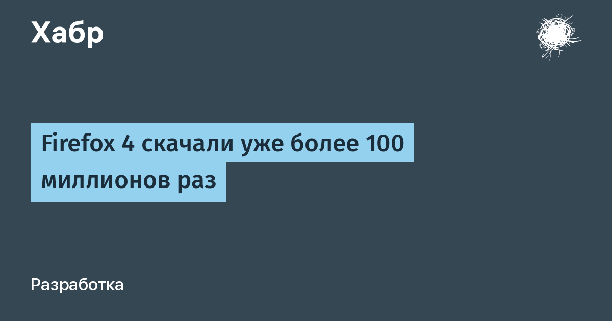Всего за месяц дистрибутив Firefox 4 был скачан более 100 миллионов раз, о чем и сообщили разработчики браузера в конце прошлой недели. На вечер воскресенья количество загрузок составило 103 миллиона. В общем-то это отличный показатель, но все равно, браузеру от Mozilla не удается получить дополнительную долю на рынке браузеров. До появления такого конкурента, как Google Chrome, популярность Firefox росла с каждым месяцем, но теперь доля рынка Firefox не увеличивается и не уменьшается. Правда, популярность Firefox 4 растет, например, по состоянию на 24 апреля доля новой версии выросла с 7,3% (начало месяца) до 8%, но это не изменяет общей доли Firefox на рынке браузеров — примерно 30%.