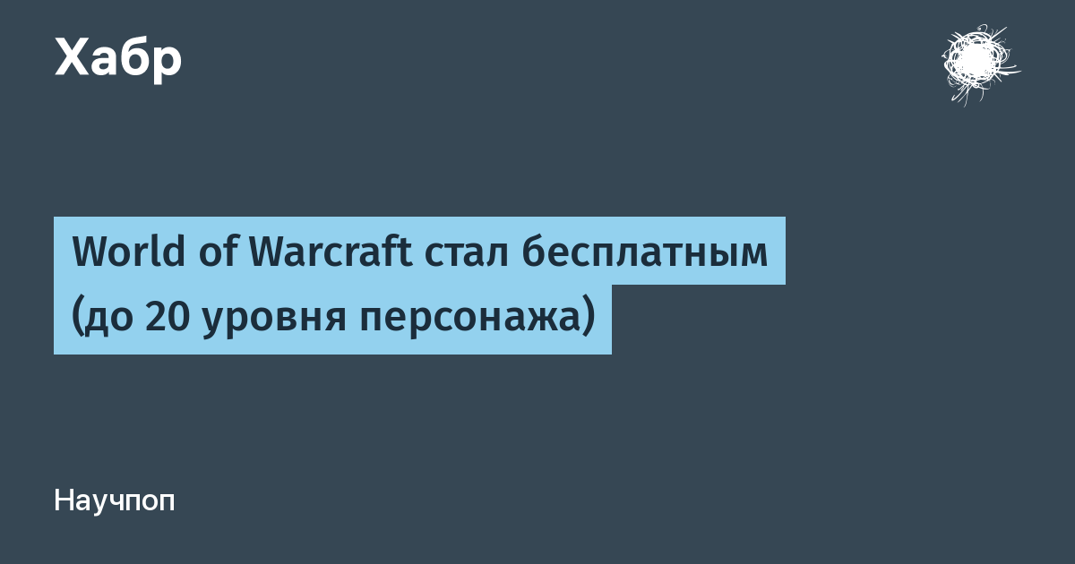 Крупнейшая в мире MMO (11,4 млн человек) сняла 14-дневное ограничение на пробную бесплатную версию игры World of Warcraft: Starter Edition. Теоретически, сейчас играть в WoW можно вечно, пока персонаж не прокачается до 20-го уровня. Дьявольский план Blizzard совершенно понятен: после 20-го уровня игрок не сможет бросить своего персонажа и начнёт платить абонентскую плату ($15 в месяц).