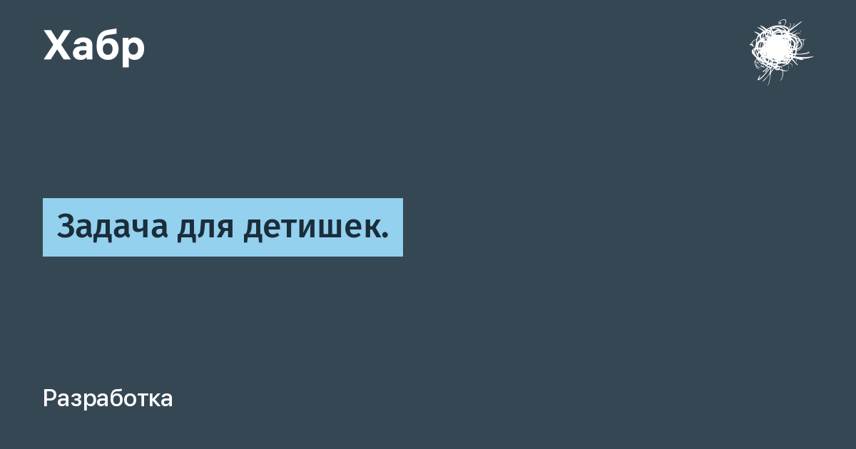 @chulak24 дек 2007 в 00:49Задача для детишек.Время на прочтение1 минОхват и читатели995Занимательные задачкиСобака = 3 Кошка = 3 Петух = 8 Корова = 2 Лягушка = 3 Утка =? P.S. Сам решил минут за 20…Теги:задачадетсаддетизанимательноХабы:Занимательные задачки