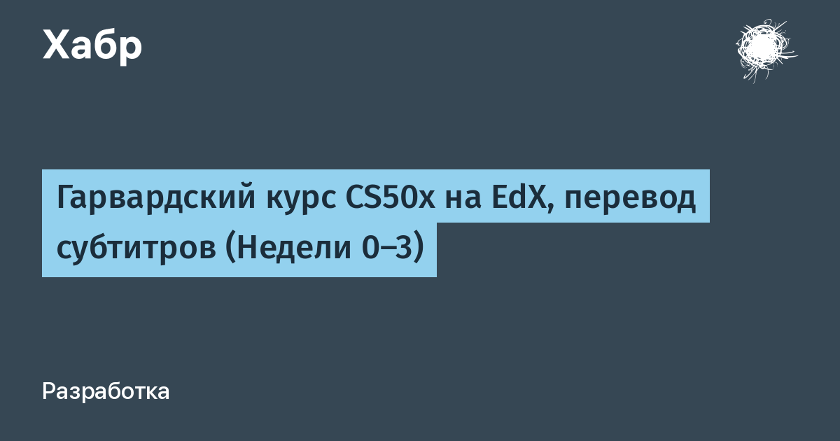 Я уже писал про CS50 здесь. Опрос показал, что народ заинтересован в переводах субтитров. Я приношу извинения за то, что забросил эту тему на некоторое время. К этому моменту у меня накопились переводы лекций с 0-ой недели по 3-тью. Думаю к концу календарного года (а может и раньше) справлюсь со всем курсом.