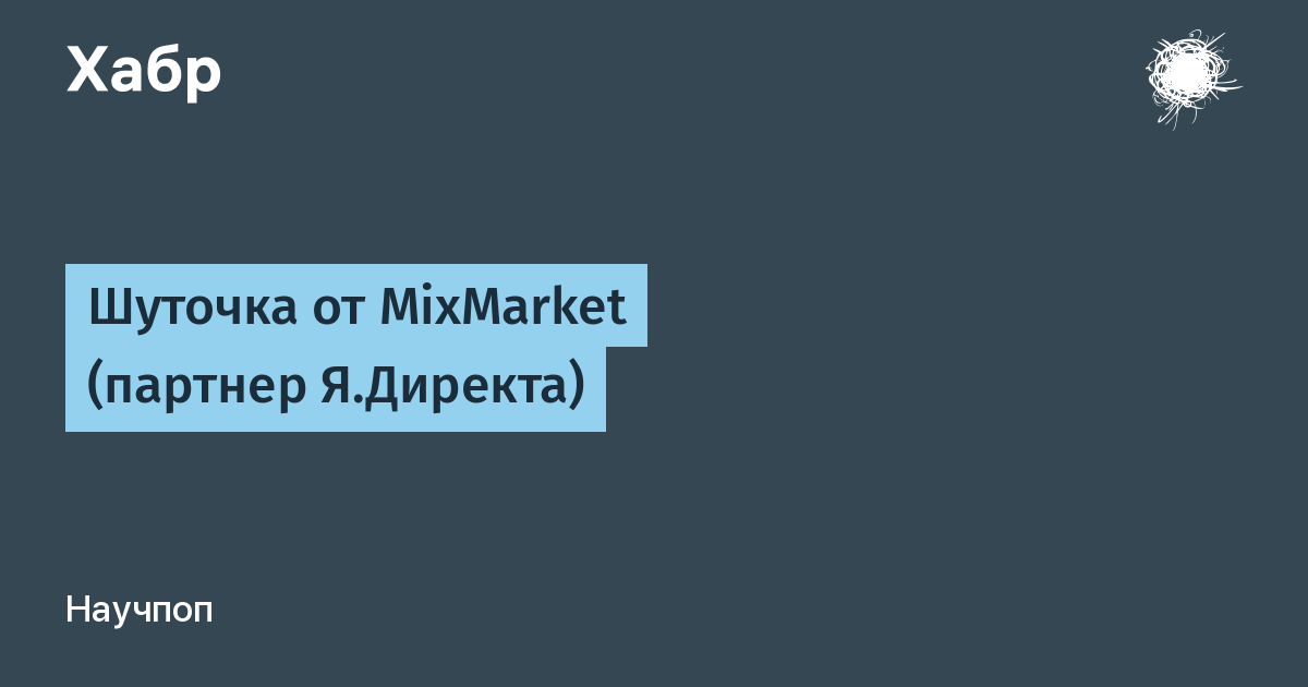@feedbee1 апр 2008 в 12:58Шуточка от MixMarket (партнер Я.Директа)Время на прочтение1 минОхват и читатели708ЧуланОчередная первоапрельская шутка. Сердце в пятки ушло. Все таки речь о деньгах, и не малых. Если бы такая шуточка на сайте банка появилась, то точно кончилось бы парачкой инфарктов О_о. При вхроде в аккаунт: Только переведя глаза на строку URL полегчало :)Теги:MixMarketЯндекс.Директ1 апреляшуткаХабы:Чулан