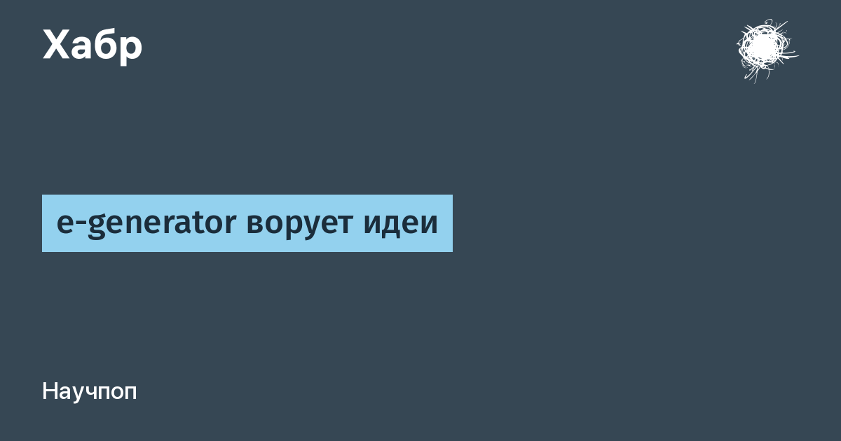 Восьмого июля на хабре я опубликовал пост с ссылкой для обсуждения моего проекта «Linkod – альтернатива интернет-ссылкам в СМИ». В тот же день на сайте e-generator.ru в рубрике «креатив» (а так же на сайте b-generator.ru который называется Венчурная фабрика) появилась запись «Интерактивная литература: идея для книгоиздателей» которая начинается со слов «Эксперт компании E-generator.ru acierto предлагает идею…» и далее идет описание моей идеи хоть и стараясь придать новизну. Я конечно возмутился и написал об этом в их форуме После этого со мной связался тот самый (а точнее самая) «Эксперт компании E-generator.ru acierto» которую зовут Ольгой и которая заявила что ее идея была другая и поступила она в базу идей e-generator две недели назад, а восьмого июля текст был изменен администрацией e-generator и размещен на сайте. После этого я конечно не имею к ней никаких претензий. Но у меня есть серьезные претензии к администрации e-generator которая в лице zashibis заявила «Ваша идея не уникальна, т.к. пришла в голову десятку наших авторов».