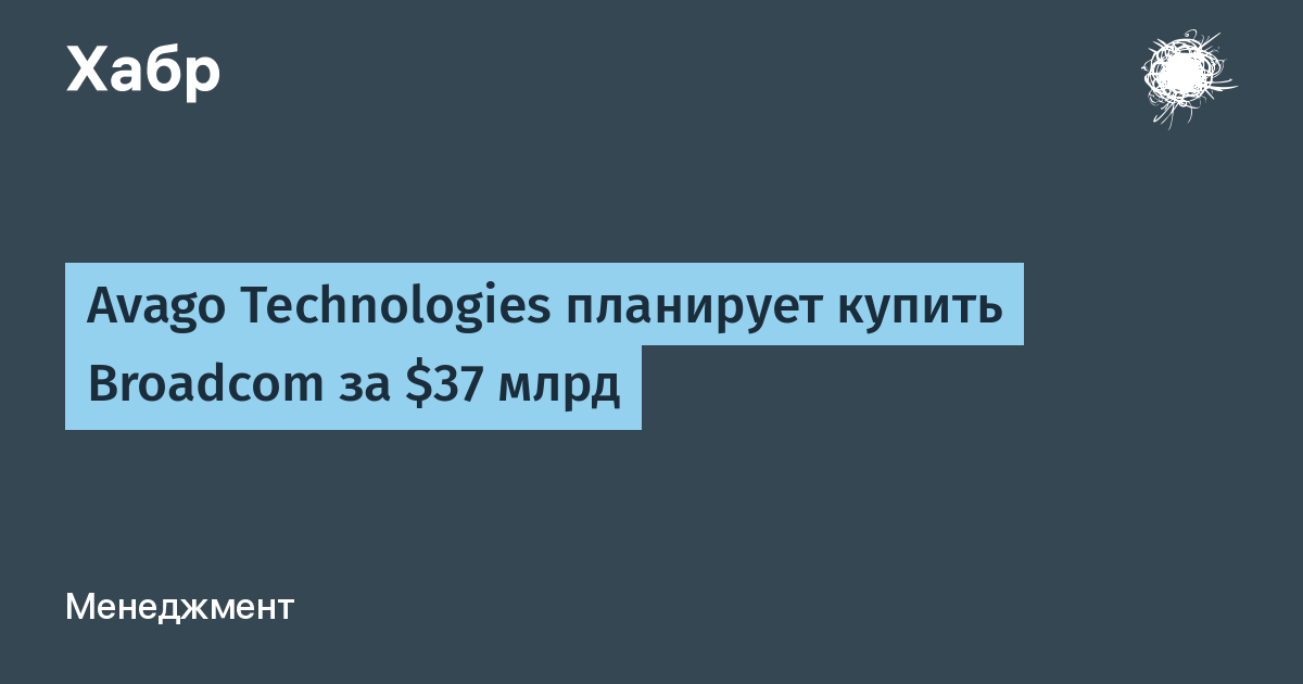 Компания Avago Technologies, производитель чипов из Сингапура, планирует приобрести конкурента, компанию Broadcom, за $37 млрд. Если сделка действительно состоится, это будет одно из наиболее заметных поглощений на рынке. Из $37 млрд часть будет оплачена наличными ($17 млрд), а часть — акциями ($20 млрд), пишут «Ведомости». После слияния объединенная компания получит имя Broadcom, но возглавлять ее будет генеральный директор Avago Хок Тан.