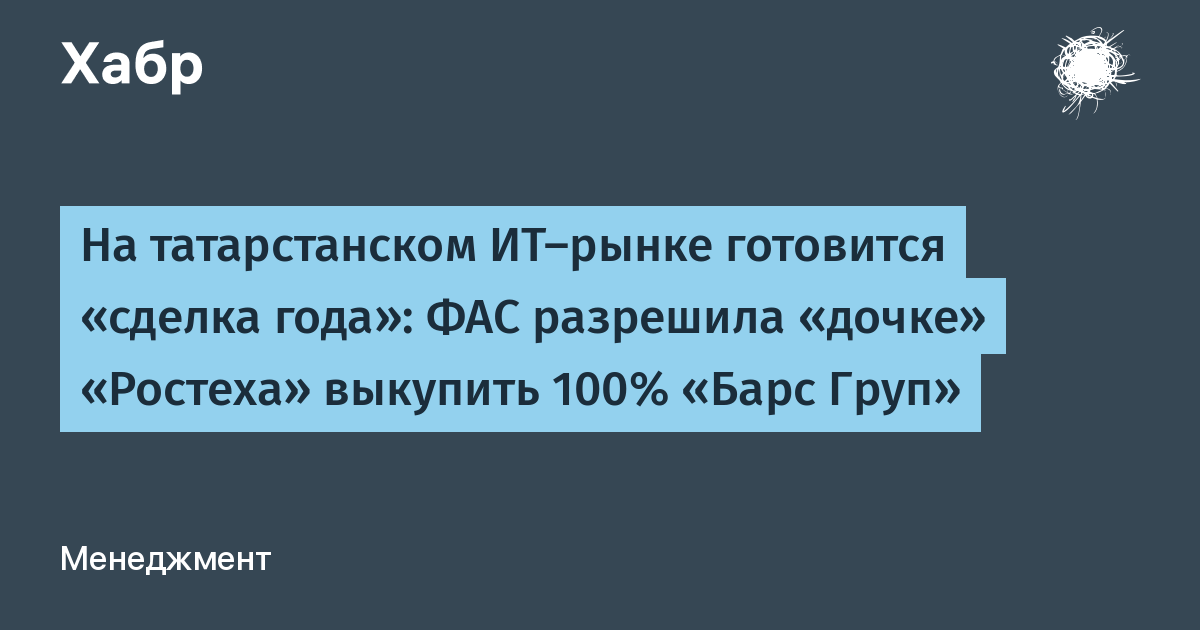 «Национальный центр информатизации» (НЦИ) подавал в Федеральную антимонопольную службу ходатайство о покупке казанского интегратора «Барс Груп». ФАС России дала согласие. НЦИ является дочерней компанией «Ростеха».