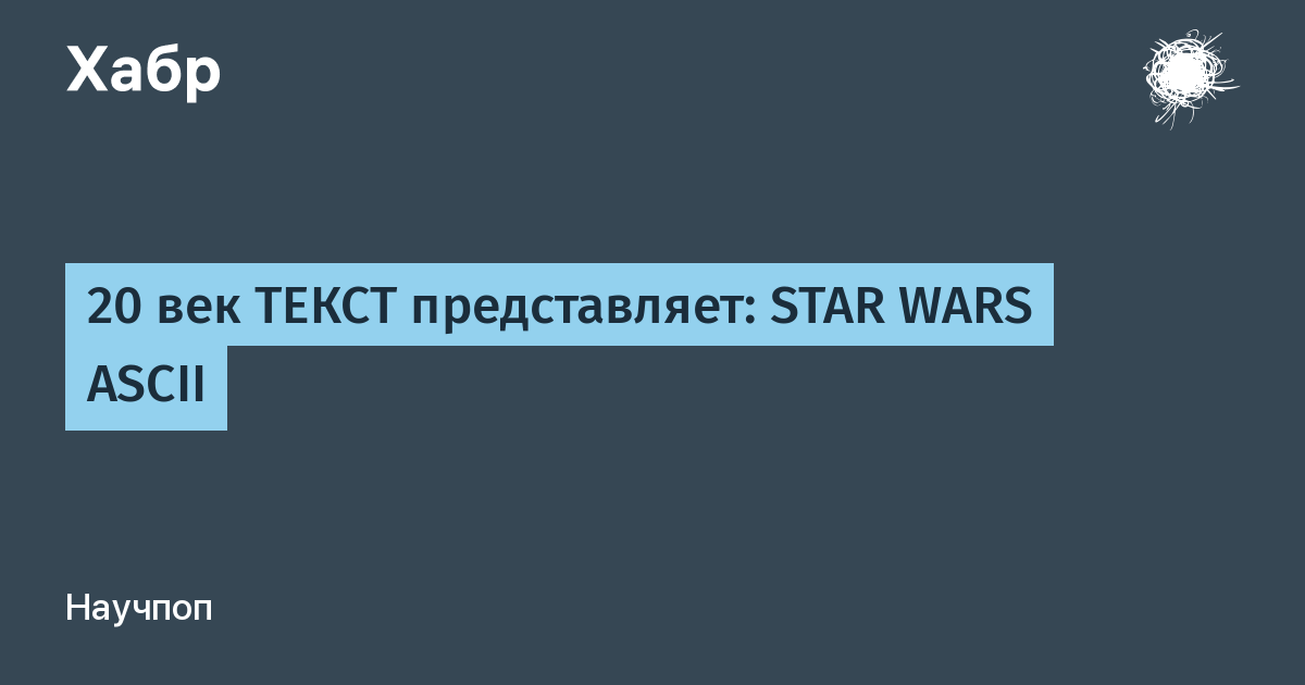 @VPK27 июл 2008 в 12:3020 век ТЕКСТ представляет: STAR WARS ASCIIВремя на прочтение1 минОхват и читатели1.2KЧуланТелнетимся к towel.blinkenlights.nl и смотрим.Теги:telnetstar warsasciiХабы:Чулан