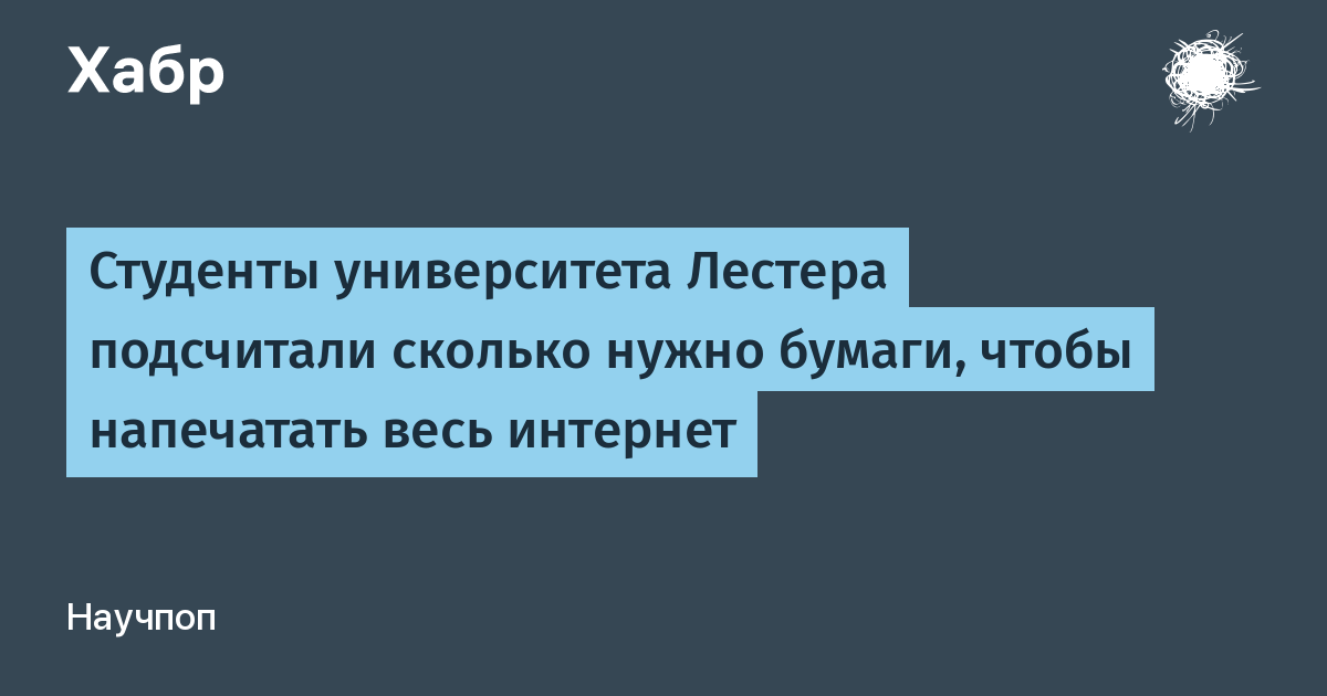 136 миллиардов листов бумаги размером 216 на 279 мм (формат А4 имеет размеры 210x297) необходимо, чтобы получить печатную копию всех примерно 4.5 миллиардов веб-страниц Интернета. Этот результат был опубликован в студенческой научной работе «How Much of the Amazon Would it Take to Print the Internet?», опубликованной в сборнике междисциплинарных трудов британского университета Лестера. Студенты подсчитали, что такое число бумаги может быть обеспечено деревьями всего лишь с 0.002% площади тропических лесов Амазонки.Методика подсчёта на самом деле довольно проста. Приняв, что англоязычная Википедия состоит из 4723991 страниц, авторы случайным образом отобрали десять из них и каждую напечатали. Выяснилось, что для печати одной статьи необходимо 15 листов бумаги. Проведя несложное умножение, студенты определили, что для печати всей Википедии необходимо 70859865 страниц.
