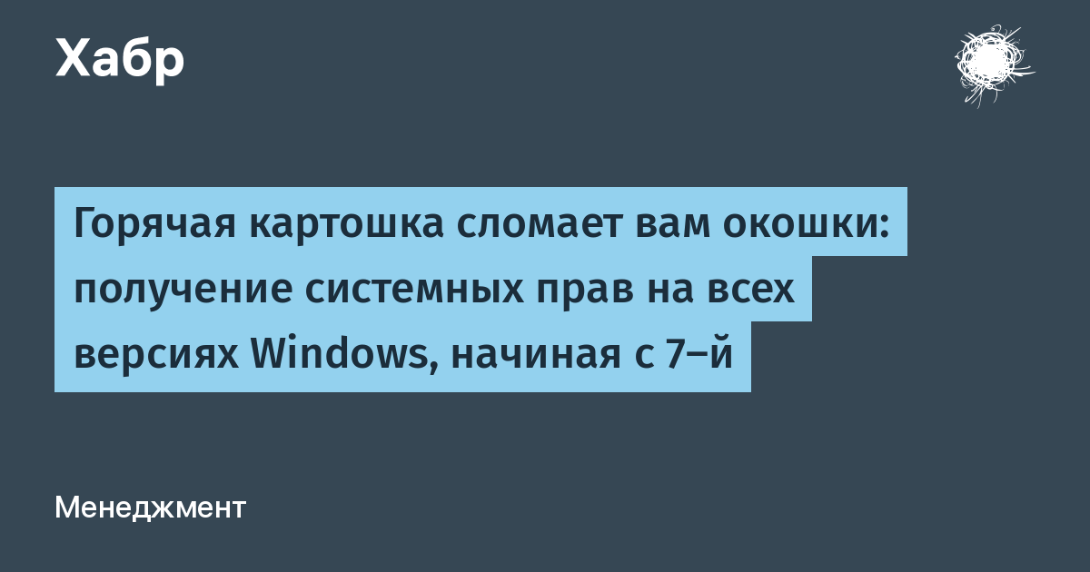 Специалисты по безопасности из компании Foxglove Security сумели объединить несколько уязвимостей операционных систем от Microsoft, самой старой из которых уже 15 лет. Систему из трёх уязвимостей, собранных в одну, назвали «Hot Potato». Эта система позволяет за разумное время поднять привилегии процесса с самого нижнего до системного, и получить тем самым контроль над ОС.Среди используемых уязвимостей — NTLM relay, атака на протокол аутентификации NT LAN Manager (конкретно HTTP->SMB relay). Другая уязвимость — «NBNS spoofing», позволяющая атакующему настроить поддельные прокси в Web Proxy Auto-Discovery Protocol. Все уязвимости работают в Windows 7, 8, 10, Server 2008 и Server 2012.