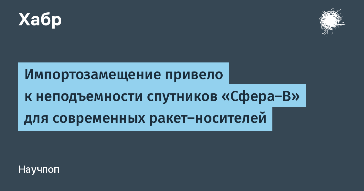 «Проблемы с импортозамещением, в частности, по линии электронной компонентной базы, привели к значительному увеличению массы аппаратов типа „Сфера-В“. Получилось так, что существующие в настоящее время у России ракеты-носители „Протон-М“, „Ангара-А5“ не в состоянии вывести на высокоэллиптическую орбиту спутники этого типа в новой, российской комплектации», — прокомментировал ситуацию источник, близкий к Минобороны.