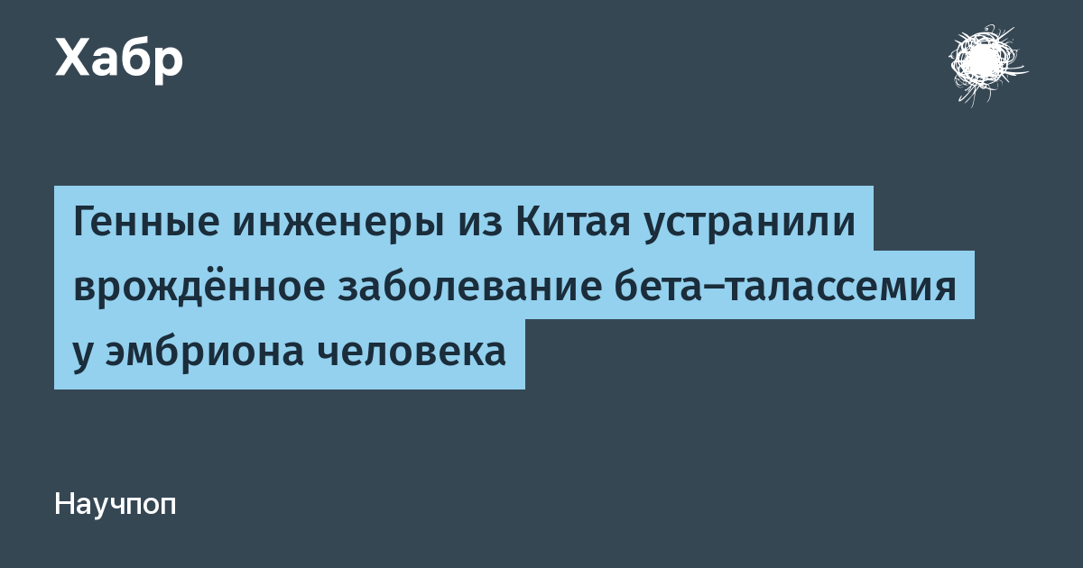 В то время как некоторые западные страны по религиозным и другим причинам запрещают генетическое редактирование человеческих эмбрионов, одним из мировых лидеров в этом научном направлении стал Китай. Направление очень перспективное, потому что после расшифровки человеческого генома учёным стало доступным беспрецедентное количество информации о маркерах точечных мутаций, когда проблема состоит в замене единственного основания в цепочке ДНК (на иллюстрации показано мутировавшее основание A>G, из-за чего возникает бета-талассемия). Если разрешить генное редактирование, то люди могли бы легко избавиться от многих из этих опасных, а иногда смертельных болезней. Это доказала сейчас группа китайских генетиков.