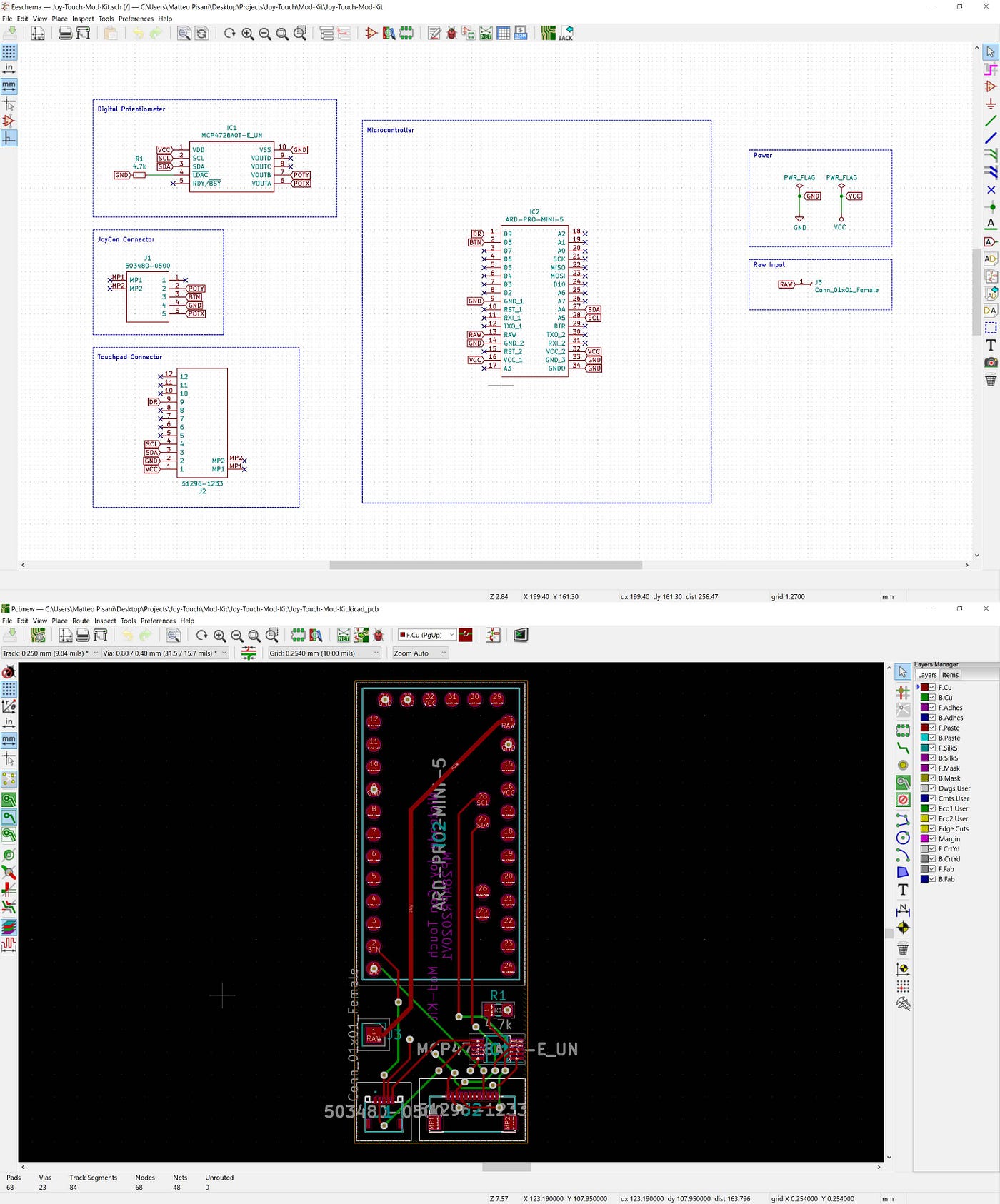 Чтобы всё было чисто и красиво, я нарисовал в KiCad схему для пары компонентов, загрузил их размеры и разработал для них специальные платы.