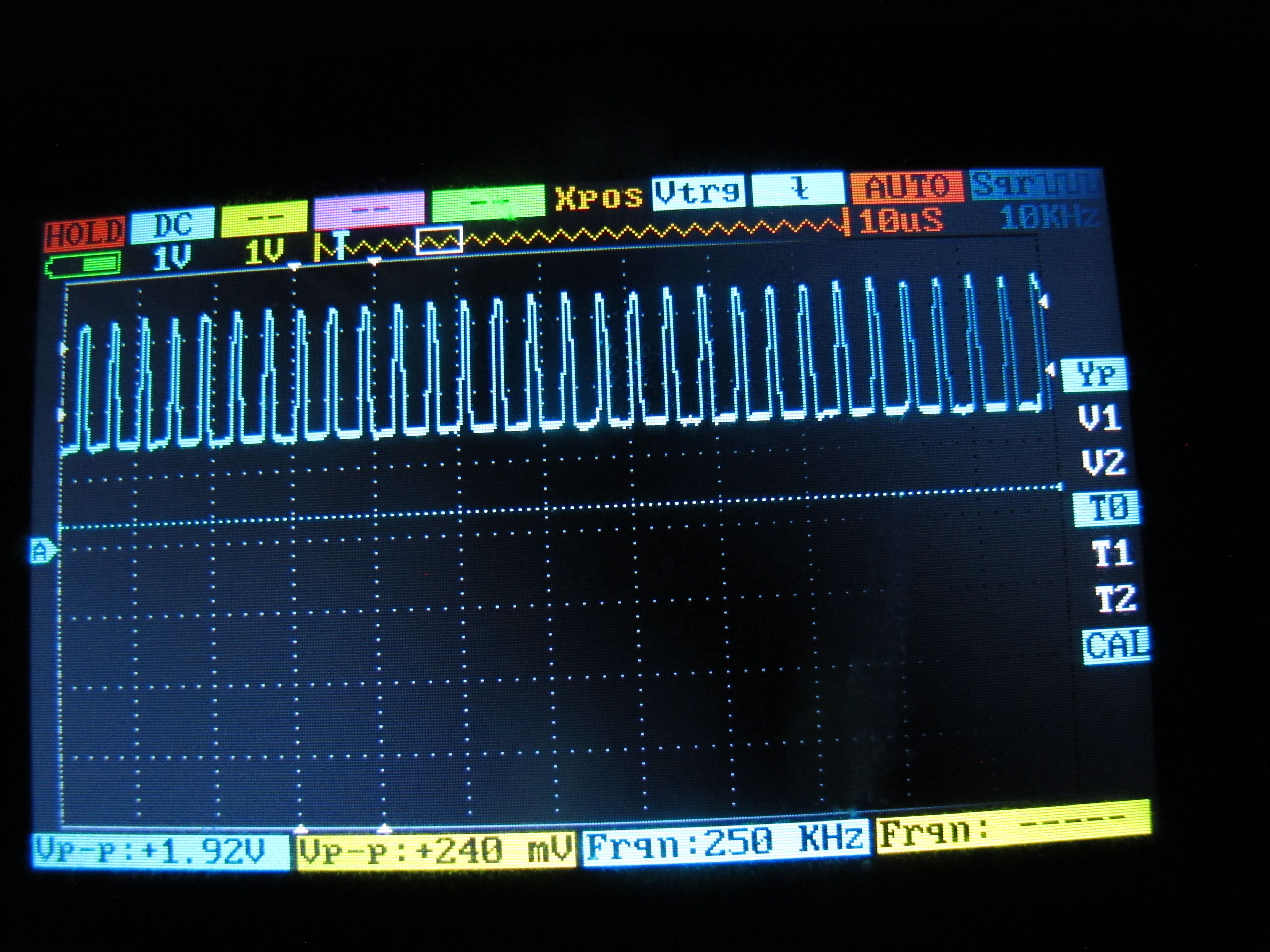 Системный тактовый генератор VIA имеет частоту 1 МГц, поэтому тактовая частота сдвига будет сигналом 500 кГц, а разрешение выводимых битов равно 250 кГц. Этого как раз хватает. Однако я не разобрался, как заставить непрерывно и плавно работать тактовую частоту сдвига. Даже после попыток точного тайминга для перезагрузки регистра сдвига интервал контакта тактовой частоты сдвига всегда выглядела вот так: