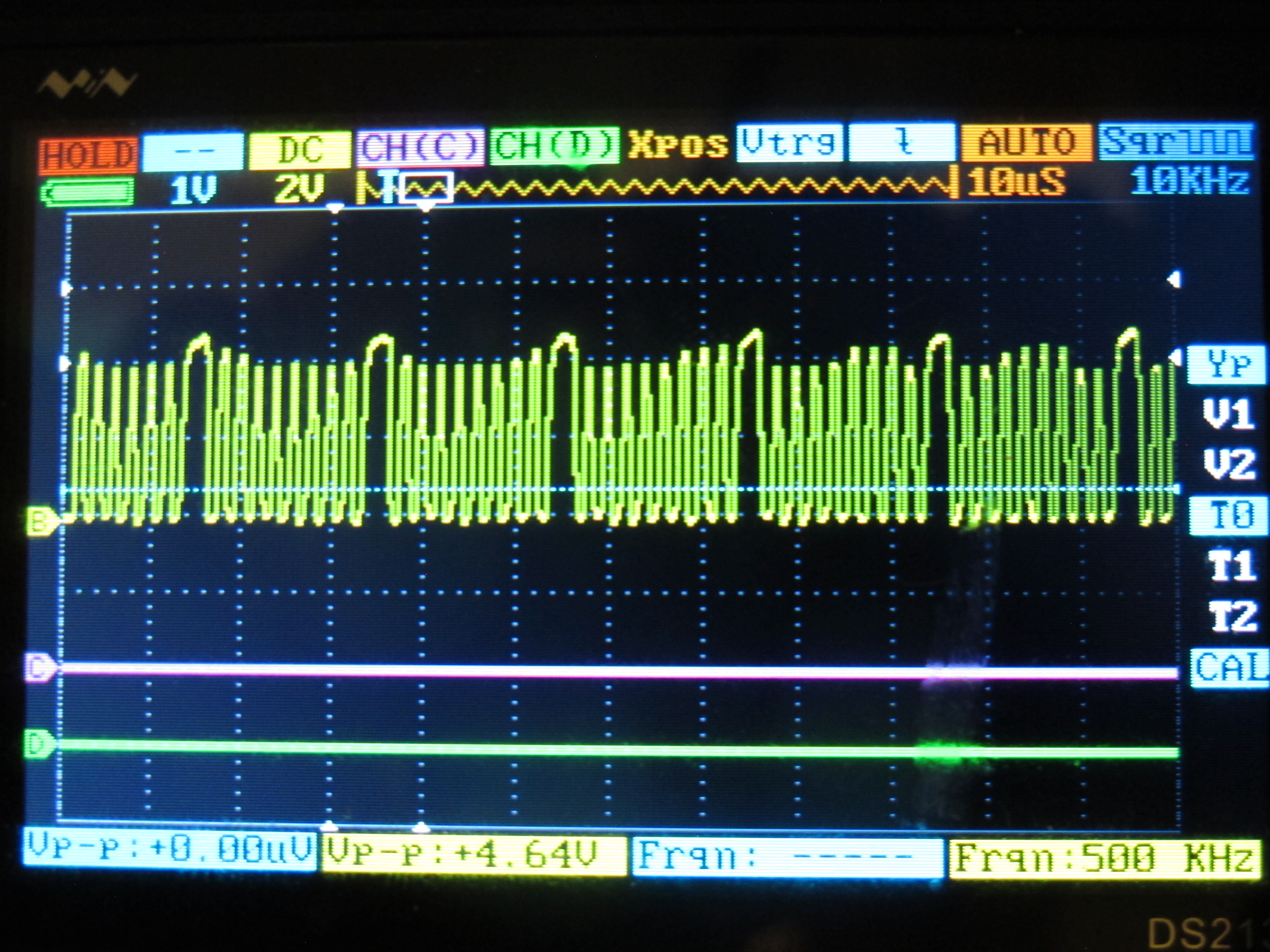 Обязательно краткое отступление о проблемах с электрикой, потому что я с ними столкнулся. При подключении случайных пар компонентов они могут заработать, но иногда требуются ухищрения. Вот интервал напряжений, изначально наблюдавшийся на контакте W/DATA привода: