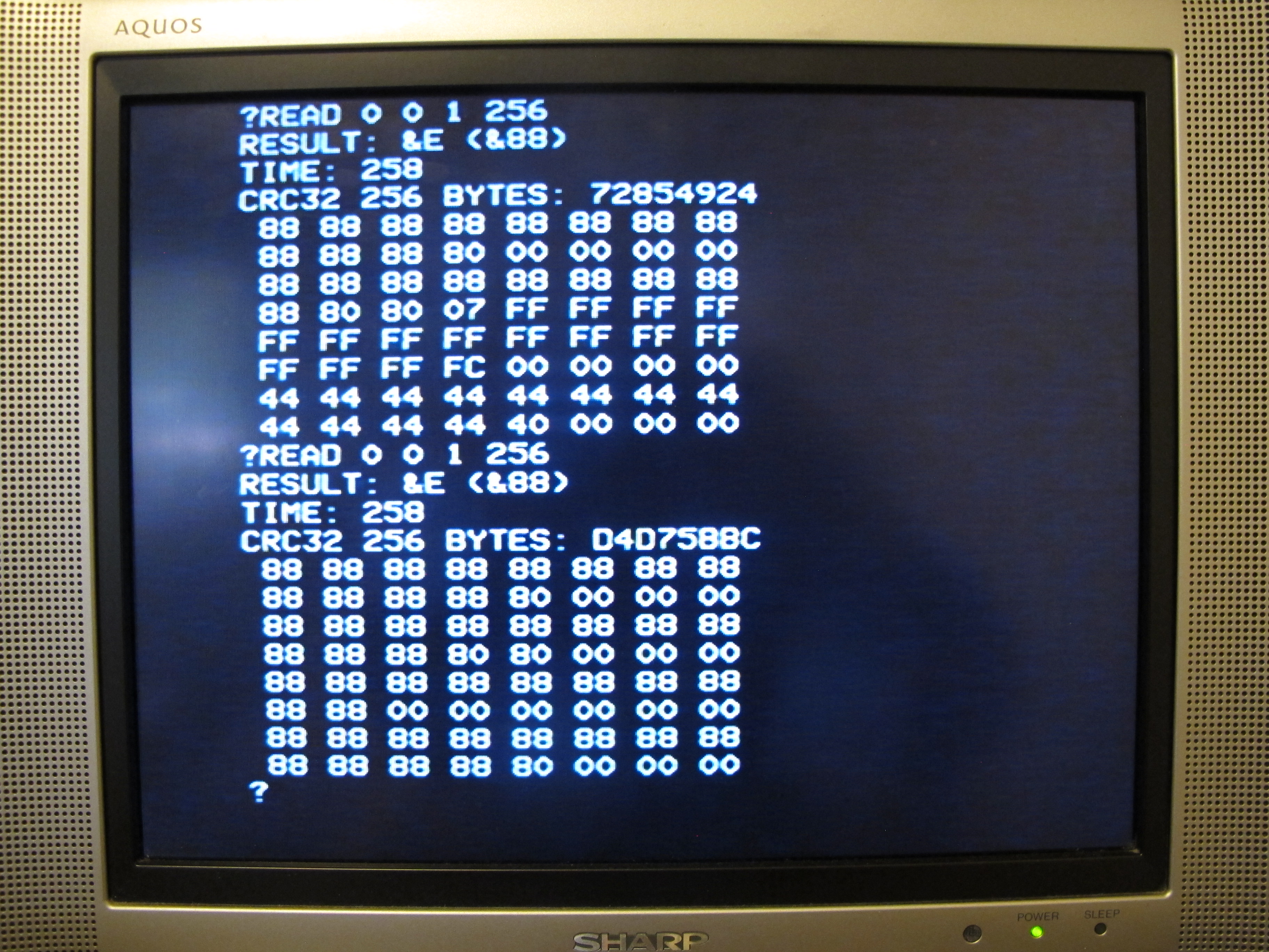 Команда FUZZ записывает полубайт 0x8, а бит данных поступательно откладывается на инкременты по 125 нс. Это похоже на описание того, как записывались нечёткие биты Dungeon Master. Как видно из скриншота, байты данных 0x88 вскоре начинают считываться неверно и недетерминированным образом. Но дисперсия не на 100% случайна, как «слабые биты» (weak bit) — дисперсия заключается в том, достаточно ли поздно записан бит 0x8, чтобы иметь вероятность быть пропущенным. Если он пропущен, мы всё равно можем увидеть, что в этом безумии есть паттерны и логика.