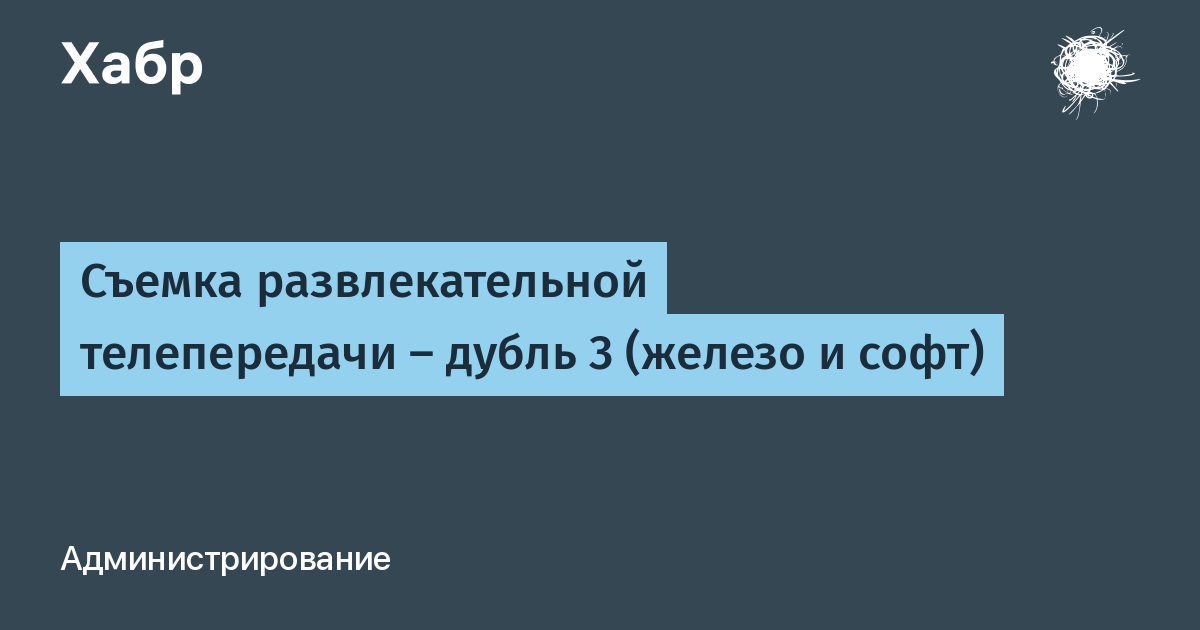 Итак, это третья часть цикла статей о том, как снимаются развлекательные телепередачи. В первой части было рассказано о предсъемочной подготовке, во второй — о процессе съемок и задействованных людях, эта часть будет о используемом программном и аппаратном обеспечении.