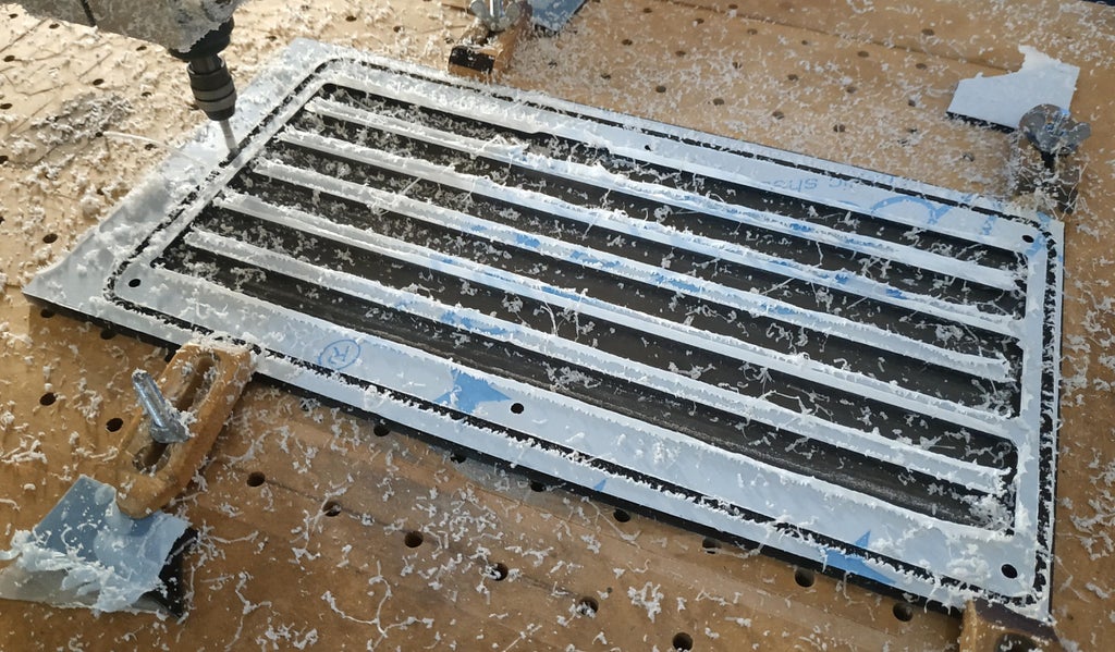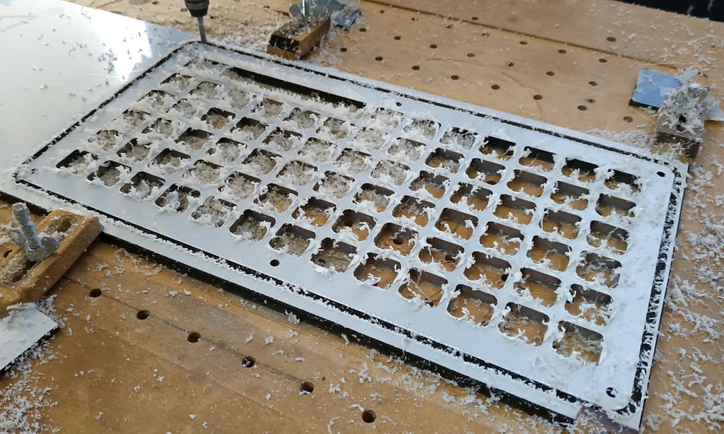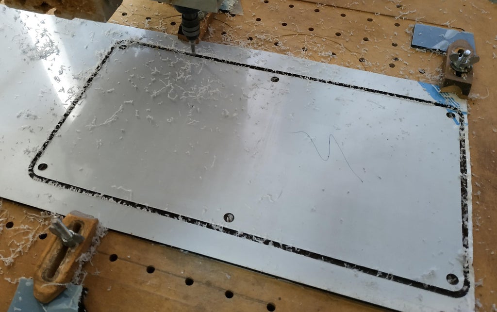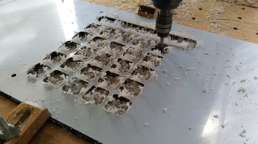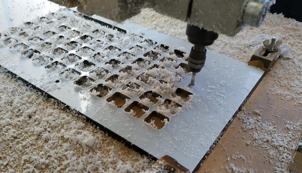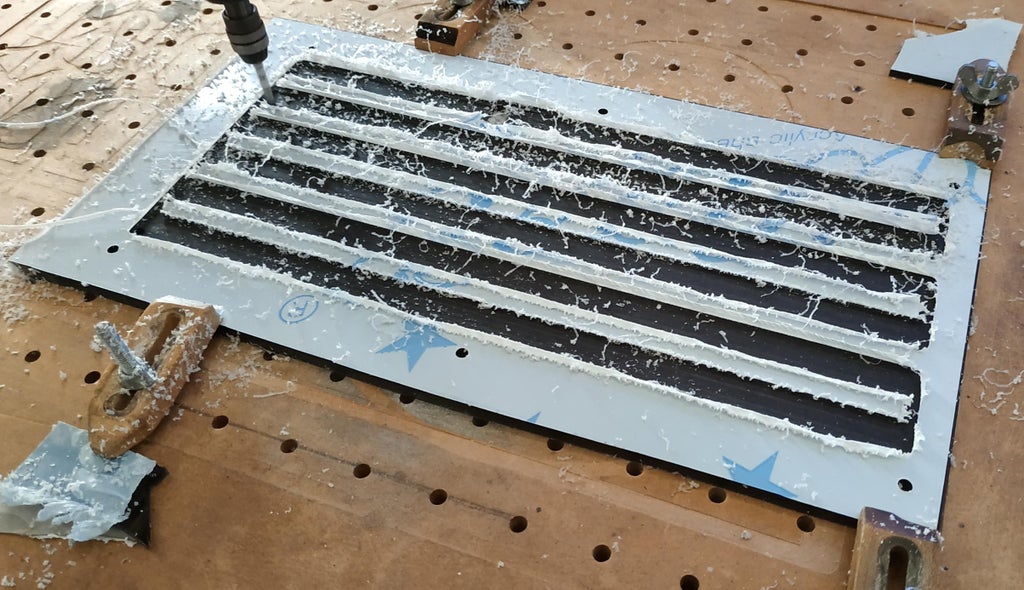 По большому счёту, скорость вращения сверла должна быть не очень большой, а скорость подачи материала – большой, чтобы избежать расплавления материала. Из-за расплавления края отрежутся плохо, кроме того оно может вызвать вибрацию и даже повреждение фрезы. Я использовал сверло на 3 мм на скорости 10000 об/мин и скорость подачи порядка 420 мм/мин. Для проделывания углублений под головки винтов я использовал сверло диаметром 5 мм. Глубина сверления – 1,5 мм. В итоге головки помещаются очень хорошо. В начале раздела приведены фотографии процесса работы и результата.