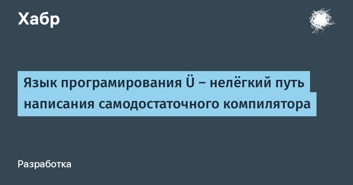 Уже несколько лет я веду разработку собственного языка программирования — Ü. Около двух лет назад я публиковал вводную статью о нём на Хабре. Компилятор этого языка написан на C++ и долгое время он таковым и оставался. Но после той публикации я пришёл к выводу, что язык Ü уже достаточно продвинут, чтобы написать на нём компилятор языка Ü. О написании этого компилятора и будет повествовать данная статья.