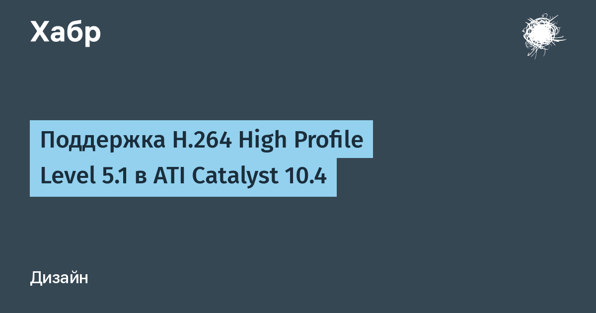 Новый драйвер ATI Catalyst 10.4 расширяет возможности аппаратного (DXVA) декодера H.264, обеспечивая поддержку профиля HP@L5.1. Для воспроизведения Blu-ray потоков достаточно соблюдать профиль HP@L4.1, что и делают большинство аппаратных декодеров, однако нередко встречается видео сжатое с запредельными параметрами кодирования. Level 5.1 является максимальным из доступных и описывает параметры которые позволяют кодировать видео например в таких режимах — 4,096×2,304@26.7 или 1,920×1,080@120.5, а поток может достигать 300 Mbps. Если имеется файл сжатый в соответствии с профилем HP@L5.1 то это еще не значит, что это будет проблемой для аппаратных декодеров, т.к. не обязательно параметры потока будут выходить за рамки Level 4.1, но среди такого материала стоит ждать проблем.