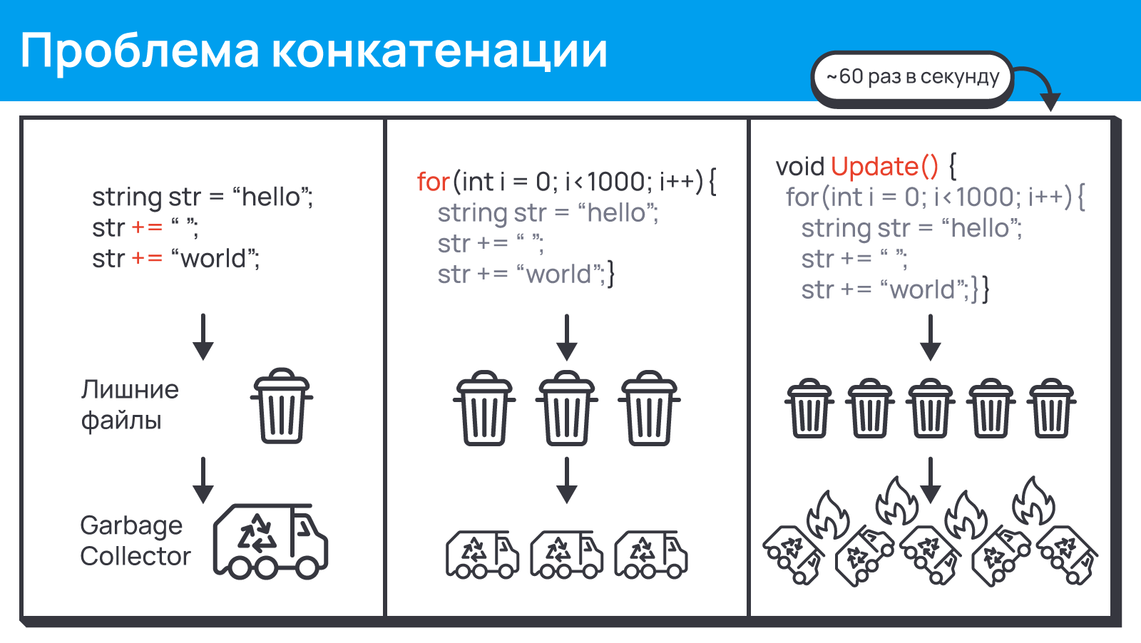 Но давайте возьмём конкатенацию, в C# она приводит к созданию нового объекта строки при каждом "склеивании", а значит будет больше "мусорных объектов" и, соответственно, вызова garbage collector'а. А теперь давайте сделаем несколько конкатенаций, поместим их в цикл под несколько сотен итераций, и находиться это всё будет в Update. Что произойдёт? Как говорится, думайте...