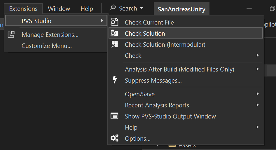 Я буду использовать Visual Studio 2022. Чтобы проанализировать проект в данной версии IDE, можно использовать пункт меню Extensions > PVS-Studio > Check Solution:
